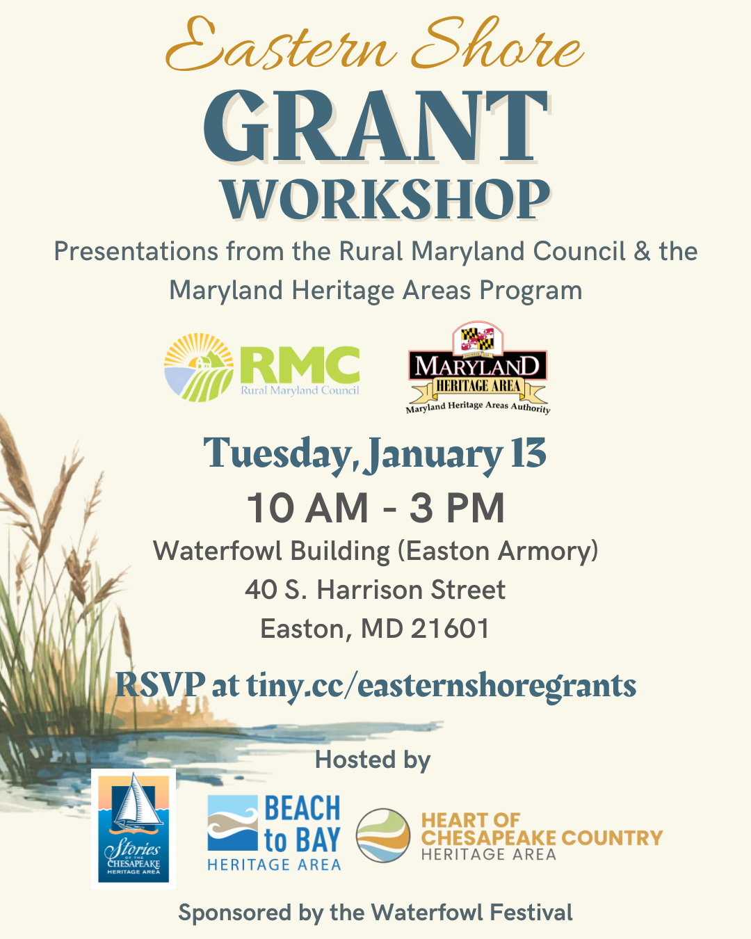 Join the Rural Maryland Council and the Maryland Heritage Areas Program for a grant information session and workshop on Tuesday, January 13 from 10 AM to 3 PM. Hosted by the Stories of the Chesapeake Heritage Area, Heart of Chesapeake Country Heritage Area, and Beach to Bay Heritage Area, this free event, sponsored by the Waterfowl Festival, is an opportunity to learn more about two state-level grant programs and hone your skills as a grant writer.
