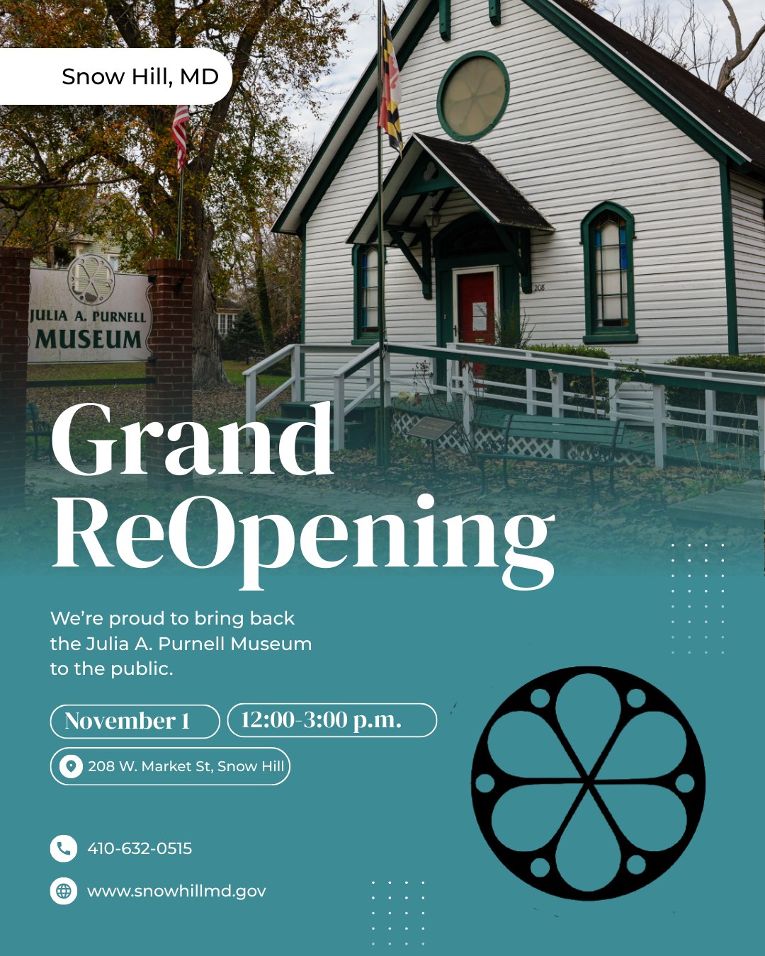 The Julia A Purnell Museum is excited to welcome you to the Grand Reopening Celebration on Friday, November 1st, from 12:00 to 3:00 PM.
